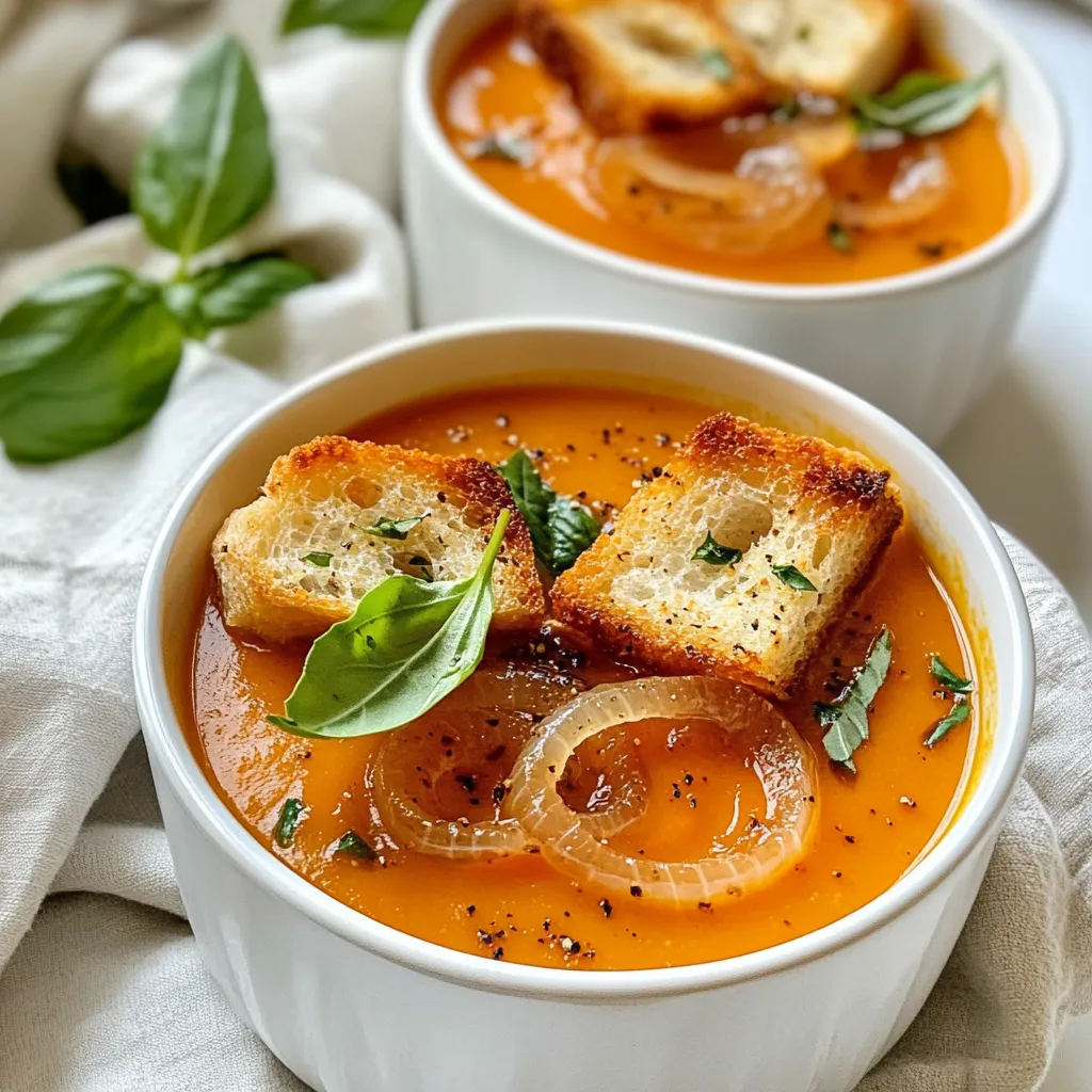 A delicious roasted tomato soup infused with fresh basil, perfect for a comforting meal.