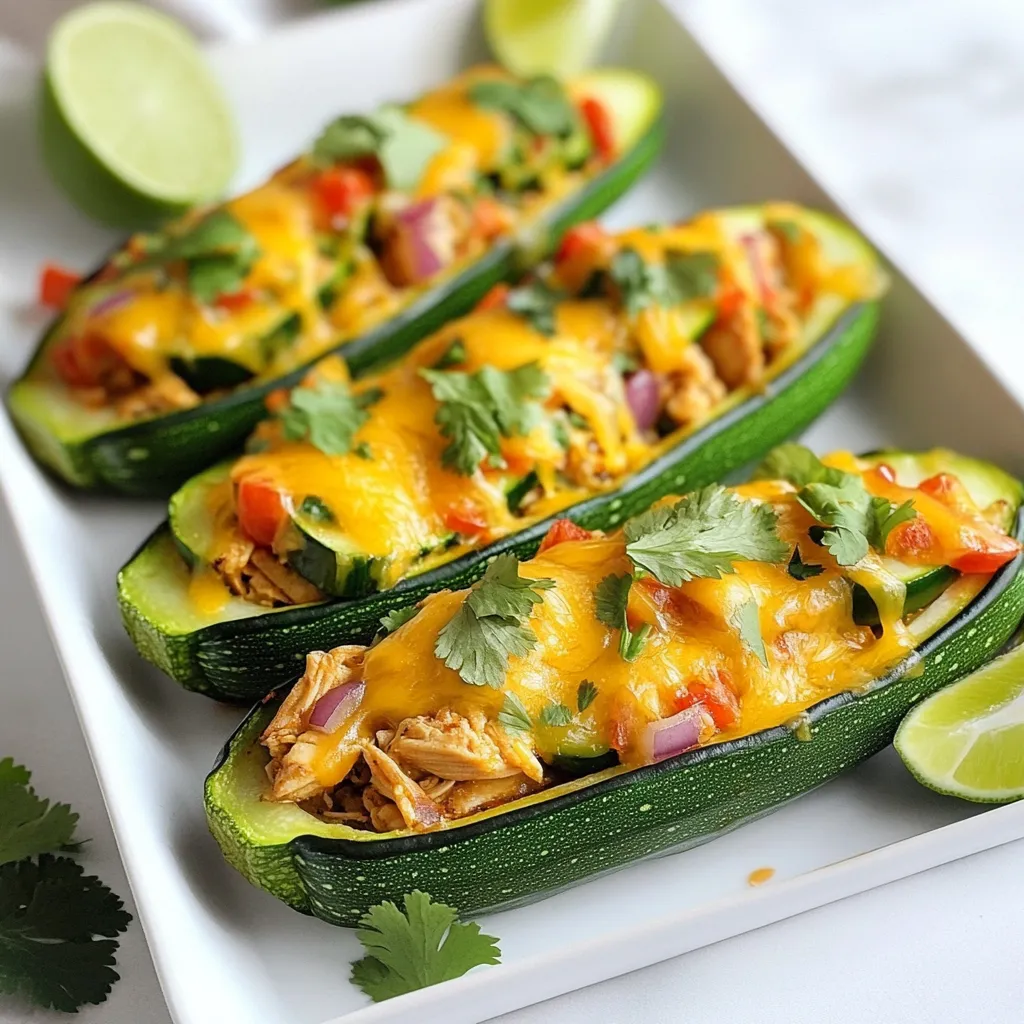 Now for the fun part! Take your cooked chicken mixture and spoon it into each zucchini half. Pack it in well so it doesn’t spill out. After that, sprinkle the remaining cheddar cheese on top of each stuffed zucchini. Return them to the oven and bake for another 10-15 minutes. Look for the cheese to melt and bubble up. Once done, take them out and garnish with fresh cilantro. Serve with lime wedges for an extra zing!