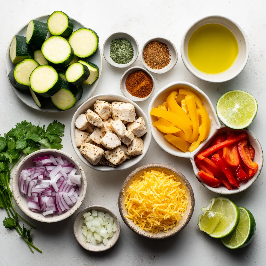 To make chicken fajita stuffed zucchini, you need fresh ingredients. Zucchini makes a great boat for the filling. Choose firm zucchinis for the best results. Chicken breasts provide lean protein and a nice texture. Use colorful bell peppers to add sweetness and crunch. The red onion and garlic give depth to the dish.