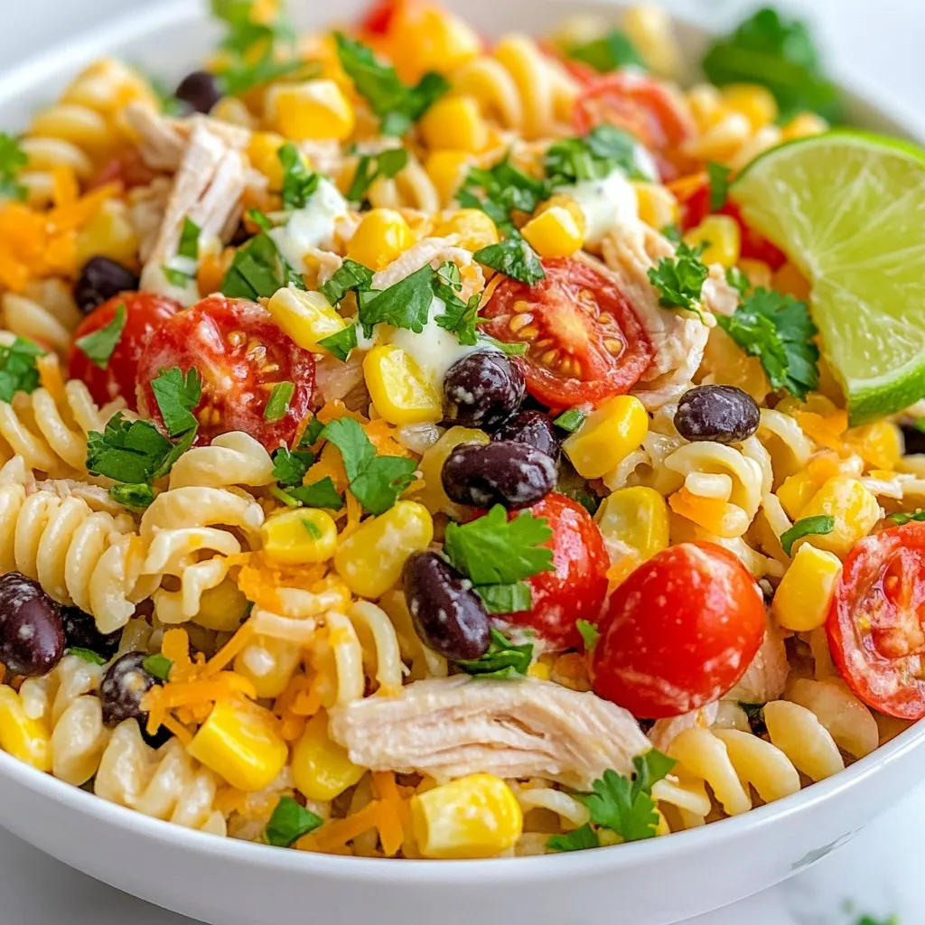 To make your Southwest Chicken Pasta Salad, gather these ingredients: - 2 cups pasta (rotini or penne) - 1 cup cooked chicken breast, shredded or diced - 1 cup cherry tomatoes, halved - 1 cup black beans, drained and rinsed - 1 cup corn (canned or frozen) - 1 red bell pepper, diced - ½ cup red onion, finely chopped - ½ cup fresh cilantro, roughly chopped - ½ cup cheddar cheese, shredded - ½ cup Greek yogurt - 2 tablespoons lime juice - 1 tablespoon olive oil - 1 teaspoon chili powder - 1 teaspoon cumin - Salt and pepper to taste Each serving of this salad has about: - Calories: 350 - Protein: 25g - Carbohydrates: 45g - Fat: 10g - Fiber: 10g This dish packs protein, fiber, and healthy fats. It gives you energy and keeps you full. When shopping, look for fresh and colorful veggies. Choose ripe cherry tomatoes and firm bell peppers. For chicken, use cooked breast for the best flavor and texture. If using canned corn or beans, check the labels for added sodium. Fresh cilantro adds a nice touch, so find bright green leaves. When picking cheese, go for sharp cheddar for more flavor. Always choose high-quality yogurt for creaminess. {{ingredient_image_1}} Start by boiling water in a large pot. Add the pasta and cook it until it is al dente. This usually takes about 8 to 10 minutes. Once done, drain the pasta and rinse it under cold water. This stops the cooking and cools it down. Set the pasta aside. Next, take a big mixing bowl. Add the shredded chicken, cherry tomatoes, black beans, corn, diced red bell pepper, and red onion. Mix these ingredients well. In a smaller bowl, whisk together Greek yogurt, lime juice, olive oil, chili powder, cumin, salt, and pepper. Make sure it’s smooth and creamy. Add the cooled pasta to the big bowl with the chicken and veggies. Now, pour the dressing over everything. Toss gently to coat all the ingredients well. Finally, fold in the fresh cilantro and cheddar cheese. Taste the salad and adjust salt and pepper as needed. Cover the bowl and chill it in the fridge for at least 30 minutes. This lets the flavors mix nicely. Before serving, stir the salad again. To get perfect pasta, always use plenty of water. This helps prevent sticking. Stir the pasta a few times while cooking. This keeps it moving and helps it cook evenly. Make sure to cook the pasta just until al dente. This means it should still have a little bite. Rinsing it under cold water after cooking stops the cooking process. This keeps the pasta from getting mushy. Preparing the dressing is simple. In a small bowl, combine Greek yogurt, lime juice, olive oil, chili powder, cumin, salt, and pepper. Whisk it until smooth. When mixing the dressing with the pasta, pour it over the ingredients. Toss everything well so each piece is coated. This ensures every bite has great flavor. Adding cilantro and cheese at the end gives a fresh taste and nice texture. To make your Southwest Chicken Pasta Salad pop, focus on fresh ingredients. Use ripe cherry tomatoes for a sweet bite. Fresh cilantro adds a bright taste. For more depth, toast your spices lightly before mixing them in. This helps release their full flavor. Lime juice brightens the dish and adds a zing. Adjust the lime juice to suit your taste. If you like it spicier, add more chili powder. Always taste as you go to find your perfect balance. One common mistake is overcooking the pasta. Cook it until it is al dente. This keeps the pasta firm and prevents it from getting mushy. Another mistake is skipping the chilling step. Chilling allows the flavors to blend well. Make sure to cover the salad tightly while it chills. This keeps it fresh and prevents it from drying out. Lastly, don’t forget to season your salad before serving. A pinch of salt and pepper can make a big difference. Garnishing your salad makes it visually appealing and adds extra flavor. Try topping it with extra cilantro for a fresh touch. A lime wedge on the side adds color and a hint of zest. You can also sprinkle more cheese on top for richness. If you like crunch, add crushed tortilla chips right before serving. This gives a nice texture contrast. Remember, the way you present your dish can make it even more enjoyable! Pro Tips Use Fresh Ingredients: Opt for fresh vegetables and herbs to enhance the flavor and nutritional value of your pasta salad. Customize Your Protein: Feel free to substitute the chicken with grilled shrimp or tofu for a different protein option. Make it Ahead: Prepare the salad a few hours in advance to allow the flavors to develop further; it tastes even better the next day! Serve Cold: Ensure the salad is well-chilled before serving to make it refreshing, especially on warm days. {{image_2}} You can easily swap ingredients in this salad. If you want a gluten-free dish, use gluten-free pasta. For dairy-free options, replace Greek yogurt with a dairy-free yogurt or avocado. If you prefer leaner protein, use turkey instead of chicken. You can also add more veggies like zucchini or carrots for extra crunch and nutrition. To spice things up, add diced jalapeños. Start with one jalapeño and taste as you go. You can always add more heat! Mix the jalapeños into the chicken and veggies. They add a nice kick and a fresh flavor. For a milder option, use pickled jalapeños. They bring a tangy taste without too much heat. To make a vegetarian Southwest pasta salad, skip the chicken. Instead, add more black beans and corn. You can use chickpeas for extra protein. Toss in some diced avocado for creaminess. You can also add grilled veggies like bell peppers and zucchini for a smoky flavor. This keeps the salad hearty and satisfying without meat. To keep your Southwest Chicken Pasta Salad fresh, store it in an airtight container. Ensure the lid seals tightly. If you have leftovers, divide the salad into smaller portions. This way, you can grab a quick meal later. You don’t need to heat this salad. Serve it cold for the best taste. If you prefer it warm, gently heat in 
