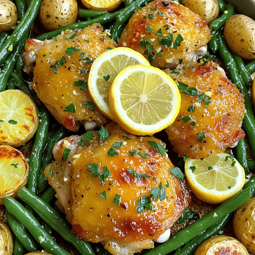 Next, scatter 1 cup of trimmed green beans around the chicken and potatoes. Drizzle the remaining garlic lemon mixture over everything. Finally, place lemon slices on top of the chicken thighs for extra flavor and a pretty look.