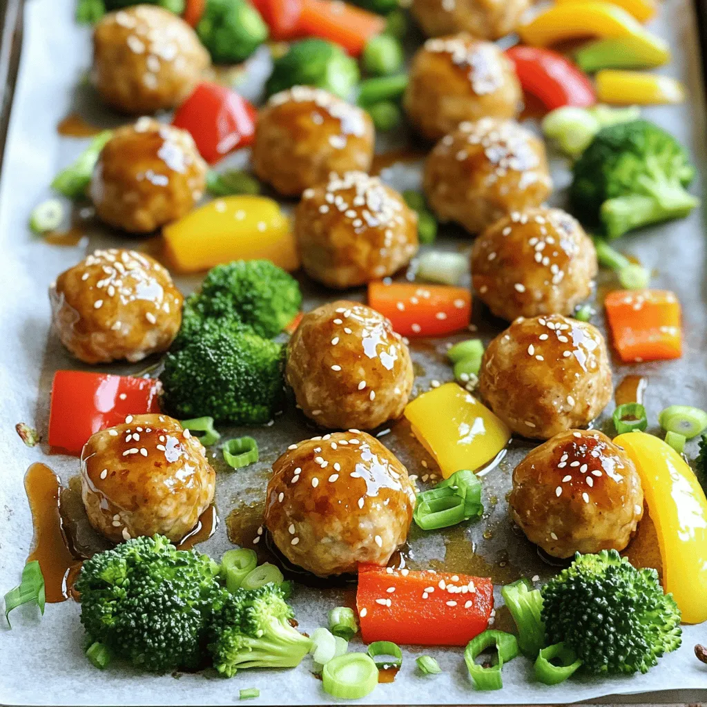 For these tasty meatballs, you need: - 1 lb ground chicken - 1/4 cup breadcrumbs - 1/4 cup grated Parmesan cheese - 1/4 cup scallions, finely chopped - 1 egg - 2 cloves garlic, minced - 1 tablespoon fresh ginger, minced - Salt and pepper to taste These ingredients create a juicy and savory base for your meatballs. Ground chicken keeps them light and tender. Breadcrumbs help bind everything together, while Parmesan adds a nice cheesy flavor. Scallions give a hint of freshness, and garlic and ginger bring warmth. Next, for the sauce, use: - 1/4 cup honey - 1/4 cup soy sauce (or tamari for gluten-free) - 1 tablespoon sesame oil The honey adds sweetness. Soy sauce brings umami depth. Sesame oil adds a nutty note, creating a balanced, rich sauce. Together, they form a great glaze that caramelizes beautifully in the oven. Finally, for the veggies and garnish, you need: - 1 cup mixed bell peppers, chopped - 1 cup broccoli florets - Sesame seeds for garnish Mixed bell peppers give a sweet crunch. Broccoli adds color and nutrition. Sesame seeds on top not only look nice but add a slight crunch, making the dish even more delicious. This combination of flavors and colors makes a feast for the eyes and the palate. First, gather your ingredients. You need ground chicken, breadcrumbs, and Parmesan cheese. Next, add finely chopped scallions, one egg, minced garlic, and fresh ginger. Season with salt and pepper. In a large bowl, mix everything well. Use your hands to combine the ingredients. This ensures each meatball has great flavor. Now, shape the mixture into meatballs. Aim for about one inch in diameter. This size helps them cook evenly. Place the meatballs on a lined baking sheet. Make sure they have space between them. This helps them brown nicely. Preheat your oven to 400°F (200°C). While it heats, prepare the sauce. Whisk together honey, soy sauce, and sesame oil in a small bowl. Drizzle half of this sauce over the meatballs. Add chopped bell peppers and broccoli florets around them on the baking sheet. Drizzle the rest of the sauce over the veggies. Bake the tray in the oven for 20-25 minutes. Check that the meatballs are cooked through and golden. For extra crispiness, broil for 2-3 minutes at the end. When done, sprinkle sesame seeds on top for a nice finish. Enjoy your meal! To make moist meatballs, start with ground chicken. It has a nice fat content. Next, add breadcrumbs for texture. They help keep the meatballs juicy. Don't skip the egg; it acts as a binder. Mix all the ingredients gently. Over-mixing can make them tough. When shaping, form them softly. This keeps them light and airy. To bake meatballs evenly, preheat your oven to 400°F (200°C). Line your baking sheet with parchment paper. This prevents sticking and makes cleanup easy. Place meatballs on the sheet with space between them. This helps hot air circulate. Add veggies around the meatballs for extra flavor. The mixed bell peppers and broccoli will cook well together. For a beautiful presentation, use a large platter. Arrange the meatballs and veggies artfully. Drizzle extra honey garlic sauce on top. Sprinkle sesame seeds over everything for crunch. You can also add fresh scallions for a pop of color. This makes your dish look as good as it tastes. Serve hot for the best experience. {{image_2}} You can easily make this dish gluten-free. Simply swap out the breadcrumbs. Use gluten-free breadcrumbs or crushed gluten-free crackers. For the soy sauce, choose tamari instead. This keeps the flavor while making it safe for those with gluten issues. If you want a different protein, ground turkey works great. It has a mild flavor and stays moist. You can also use ground pork or beef. Just be mindful of the cooking time. Each protein may require a slight adjustment. Feel free to change the veggies to your liking. Zucchini or snap peas add a nice crunch. Carrots or green beans also work well. You can mix and match based on what you have. This keeps the dish fresh and exciting every time you make it. To store leftovers, let the meatballs cool down to room temperature. Then, place them in an airtight container. You can store the meatballs and veggies together or separately. Keep them in the fridge for up to three days. If you want to store them longer, freeze the meatballs. Use freezer-safe bags or containers. They can last up to three months in the freezer. When you're ready to eat the leftovers, you can reheat them easily. If they are in the fridge, heat them in the oven at 350°F (175°C) for about 10-15 minutes. If you're in a hurry, you can use the microwave. Heat in 30-second intervals, checking often. For frozen meatballs, thaw them overnight in the fridge. Then, follow the same reheating steps. Meal prep is a great way to save time. You can make a big batch of meatballs ahead of time. Shape and bake the meatballs, then let them cool. Store them in meal prep containers with your choice of veggies. This way, you can grab a meal when you need it. Feel free to mix and match sides like rice or quinoa for variety. Yes, you can use frozen chicken. However, make sure to fully thaw it first. Thawing helps the chicken mix well with other ingredients. It also ensures even cooking. If you skip this step, the meatballs may not cook through properly. Always check that the chicken reaches an internal temperature of 165°F. To keep meatballs moist, use ground chicken with some fat. Adding breadcrumbs and Parmesan cheese helps too. The egg in the mix binds everything and adds moisture. Be careful not to overbake the meatballs. Check them around the 20-minute mark. If they feel firm, they are done. You can also drizzle some sauce on them before serving for extra moisture. You can easily change the sauce flavor. Try adding sriracha for heat or lime juice for tang. Use different types of honey, like wildflower honey, for a unique twist. You can also mix in some fresh herbs like cilantro or basil. Experiment with spices too. A pinch of red pepper 