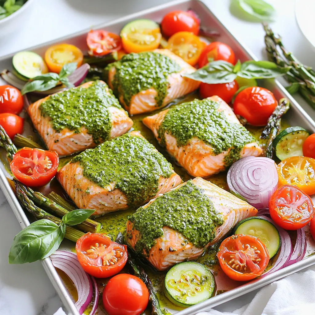 You can swap salmon for other fish like cod or tilapia. These fish also cook well on a sheet pan and take on flavors nicely. If you prefer a vegetarian option, try chickpeas or tofu. Both options add protein and soak up the yummy pesto flavor.