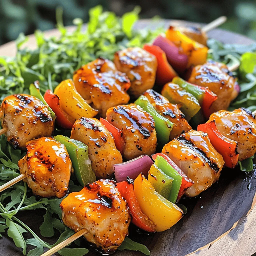 - 1.5 pounds boneless, skinless chicken thighs - 1/4 cup honey - 1/4 cup Sriracha sauce - 2 tablespoons soy sauce - 1 tablespoon sesame oil - 2 garlic cloves, minced - 1 teaspoon ground ginger - 1 tablespoon lime juice - 1 bell pepper (any color), cut into 1-inch pieces - 1 medium red onion, cut into wedges - Wooden or metal skewers You can swap chicken thighs for chicken breast or pork. For a vegan twist, use tofu. You might also try tempeh or seitan. If you want a different flavor, consider using a sweet chili sauce instead of Sriracha. For a gluten-free option, use tamari instead of soy sauce. For quality chicken, visit a local butcher or a trusted grocery store. Look for chicken that feels firm and has a pink color. When selecting vegetables, pick bell peppers that are firm and vibrant. A red onion should feel heavy for its size and have dry skin. Always choose fresh, in-season produce for the best taste. To make the marinade, mix these ingredients in a large bowl: - 1/4 cup honey - 1/4 cup Sriracha sauce - 2 tablespoons soy sauce - 1 tablespoon sesame oil - 2 minced garlic cloves - 1 teaspoon ground ginger - 1 tablespoon lime juice Stir until everything blends well. Add the chicken cubes and coat them nicely with the marinade. Cover the bowl and put it in the fridge. Let it marinate for at least 30 minutes. For a stronger flavor, you can marinate it for up to 2 hours. If you use wooden skewers, soak them in water for at least 30 minutes. This step stops them from burning on the grill. If you choose metal skewers, you can skip this step. Metal skewers are reusable and won't catch fire. Once the chicken is marinated, it’s time to thread the ingredients. Take a skewer and add chicken, bell pepper pieces, and onion wedges. Alternate the pieces to create a nice look. Make sure not to pack them too tightly. This way, they cook evenly and get nice grill marks. Preheat your grill to medium-high heat. Place the kabobs on the grill and cook them for about 10 to 12 minutes. Turn them every few minutes. The chicken should be cooked all the way through. It should not be pink in the center. The vegetables should also have nice grill marks. In the last few minutes of grilling, take any leftover marinade and brush it over the kabobs. This adds an extra layer of flavor and makes them shine. Glazing is important because it enhances the taste and makes the kabobs look great. When the kabobs are ready, take them off the grill and let them rest for a couple of minutes. Serve them warm with sides like rice, a fresh salad, or flatbread. For a beautiful dish, place the kabobs on a large platter with fresh lettuce or herbs. Drizzle extra Sriracha or honey on top just before serving for a stunning finish. - Cooking tips for juicy chicken: Start with chicken thighs. They stay moist and tender. Marinate the chicken for at least 30 minutes. This adds flavor and moisture. Use a mix of honey and Sriracha for a sweet and spicy kick. Ensure your grill is hot before adding kabobs. This helps to sear the meat quickly. - Avoiding common grilling mistakes: Don't overcrowd the skewers. Leave space between the pieces. This allows heat to circulate. Always check for doneness. Chicken should reach 165°F in the center. If you see pink, keep grilling. - Adding herbs or spices to the marinade: Fresh herbs like cilantro or basil work well. Add them to the marinade for extra freshness. You can also try a pinch of cumin or smoked paprika. These will give your kabobs a unique taste. - Experimenting with different sauces: While Sriracha and honey are great, consider other options. Try teriyaki sauce for a sweet Asian twist. Or use barbecue sauce for a smoky flavor. You can even mix sauces for a unique blend. - Oven roasting instructions: Preheat your oven to 400°F. Arrange the kabobs on a baking sheet lined with foil. Roast for about 15-20 minutes. Turn them halfway through for even cooking. - Stovetop alternatives: If you don't have a grill, use a skillet. Heat some oil over medium-high heat. Cook the kabobs for about 10 minutes, rotating often. This method gives a nice sear while keeping the chicken juicy. {{image_2}} You can swap out chicken for beef or shrimp. Beef adds a rich flavor, while shrimp cooks fast and soaks up the marinade well. If you want a vegetarian dish, try using firm tofu or tempeh. These options work great with the same marinade. If you love sweet and spicy, try adding more honey or Sriracha. You can also blend in some mango or pineapple juice for a fruity kick. This makes the kabobs sweeter and adds a bright flavor. Experiment with different spice levels to find what suits you best. Use seasonal vegetables like zucchini, cherry tomatoes, or mushrooms. These add color and texture to your kabobs. You can also use fruits like peaches or pineapples. The fruit caramelizes on the grill, adding a sweet touch that pairs well with the spicy chicken. To keep your kabobs fresh, store them in the fridge. Use an airtight container for best results. They will stay good for up to three days. If you want to save them longer, freeze the kabobs. Wrap them tightly in plastic wrap or foil. Place them in a freezer-safe bag. They can last for up to three months in the freezer. When you're ready to eat your leftovers, reheat them safely. You can use the microwave or the oven. If using a microwave, place kabobs on a plate and cover them. Heat in 30-second bursts until warm. For the oven, preheat it to 350°F (175°C). Place kabobs on a baking sheet and heat for about 10-15 minutes. This will help keep the flavors and textures nice. Preparing kabobs ahead of time is easy. You can marinate the chicken and store it in the fridge. This makes your cooking time faster on busy days. Portion out the chicken and veggies for meal plans. Use small containers to keep everything organized. This way, you can grab and go when you need a quick meal. I recommend marinating the chicken for at least 30 minutes. For the best flavor, you can go up