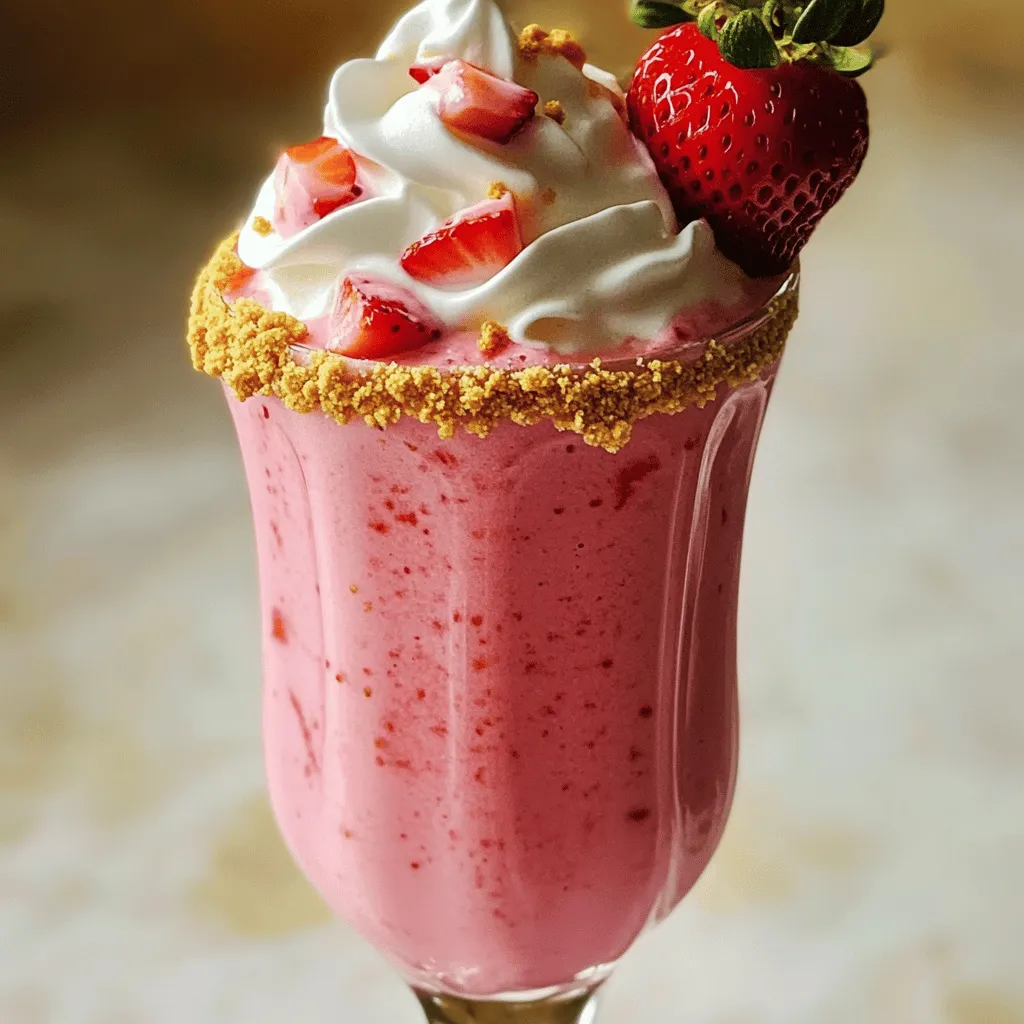 To make a tasty strawberry cheesecake milkshake, you need fresh and simple ingredients. Here’s what you will need: - 1 cup fresh strawberries, hulled and halved - 1 cup vanilla ice cream - ½ cup cream cheese, softened - ½ cup milk - 2 tablespoons powdered sugar - 1 teaspoon vanilla extract - Crushed graham crackers for garnish - Whipped cream for topping Each ingredient plays a key role in the flavor and texture of your milkshake. The strawberries give a bright, fruity taste. The vanilla ice cream adds creaminess and sweetness. Cream cheese brings a rich, cheesecake flavor. Milk helps blend everything smoothly. Powdered sugar sweetens it just right, while vanilla extract boosts flavor. The graham crackers add crunch, and whipped cream makes it look special. You can add extra ingredients for fun twists. Try adding a splash of lemon juice for a zesty kick. A pinch of salt can enhance sweetness too. If you want a chocolate twist, add chocolate syrup or cocoa powder. For a nutty taste, you can mix in crushed nuts like almonds or pecans. These choices can take your milkshake to the next level! For the full recipe, check out the details above. To make the milkshake, start by gathering your ingredients. Add 1 cup of fresh strawberries to your blender. Next, add 1 cup of vanilla ice cream, ½ cup of softened cream cheese, and ½ cup of milk. Then, sprinkle in 2 tablespoons of powdered sugar and 1 teaspoon of vanilla extract. Blend everything on high until it turns smooth and creamy. If the mixture seems too thick, you can add a splash more milk. If you want some strawberry bits, toss in a few extra strawberries and pulse a couple of times. Prepare your glasses for the milkshake. First, take a small plate and pour a little water or milk on it. Dip the rims of your glasses into this liquid. Next, roll the wet rims in crushed graham crackers. This simple step adds a nice crunch and taste. Once the glasses are ready, it's time to pour in your milkshake. To make the best milkshake, keep a few tips in mind. Always use ripe strawberries for the best flavor. If you like it sweeter, add more powdered sugar until it suits your taste. For a thicker texture, use less milk or more cream cheese. Don’t forget to top your milkshake with whipped cream and extra crushed graham crackers. This adds a fun look and extra flavor. You can also garnish with a fresh strawberry on the glass rim for an extra touch. Enjoy your delightful strawberry cheesecake milkshake! To make your milkshake super creamy, use high-quality ice cream. Vanilla ice cream works best here. You can also add cream cheese for richness. This helps blend flavors well. Blend on high until the mixture is smooth. If it seems thick, add a little more milk. This will help reach your desired consistency. You might want to stop and scrape the sides of the blender too. This step ensures all ingredients mix evenly. Taste your milkshake before serving. You may want more sweetness. If so, add a bit more powdered sugar. Start with just a teaspoon. Blend again and taste it. Adjusting sweetness is key for balance. If you use sweeter strawberries, you may need less sugar. Always remember to keep tasting as you go. Garnishing makes your milkshake look fancy! Use crushed graham crackers around the glass rim. This adds a nice crunch. Top your milkshake with whipped cream for a fluffy finish. You can sprinkle more crushed crackers on top too. Add a fresh strawberry on the rim for color. This small touch makes a big difference. For more fun, try adding a colorful straw or a cute drink umbrella. All these details make your milkshake inviting and special. {{image_2}} You can change the strawberries for other berries. Try using blueberries or raspberries. These berries add their own unique taste. A mixed berry milkshake can be fruity and fun. Blend equal parts of each berry for a new twist. You can even make a berry swirl by layering the flavors. If you want a dairy-free milkshake, swap the ice cream. Use coconut milk or almond milk. You can also use dairy-free cream cheese. This keeps the creamy texture without dairy. Look for dairy-free ice cream to mix in. It’s just as tasty and creamy! You can make your milkshake more exciting. Try adding chocolate syrup or cocoa powder. This adds a rich chocolate flavor. Nuts like crushed almonds or walnuts can add crunch. You can even sprinkle some cinnamon for a warm touch. Get creative and mix flavors that you love! For the full recipe, you can check the main section above. To keep your strawberry cheesecake milkshake fresh, store it in an airtight container. Place it in the fridge and use it within one day. The milkshake can lose its creaminess if left too long. Before you sip, give it a good stir to mix any ingredients that may have separated. You can freeze this milkshake for later enjoyment. Pour it into a freezer-safe container, leaving some space for expansion. When you want to enjoy it again, let it thaw in the fridge overnight. Blend it again for a smooth texture before serving. Fresh strawberries last about three days in the fridge. Vanilla ice cream can stay good for up to two months in the freezer. Cream cheese stays fresh for about two weeks once opened. Always check the expiration dates. Using fresh ingredients ensures the best flavor. For the full recipe, check the earlier section. I love using fresh, ripe strawberries. They should be bright red and sweet. Look for berries that are firm and have a nice smell. These qualities give your milkshake a great flavor. Yes, you can use frozen strawberries. They work well too and are convenient. Just let them thaw a bit for easier blending. This option can make your milkshake cold and thick. To lighten it up, use low-fat cream cheese and ice cream. You can also swap whole milk for almond or skim milk. This way, you still get the yummy flavor with fewer calories. If your milkshake is too runny, add more ice cream or cream cheese. You can also try blending in some crushed