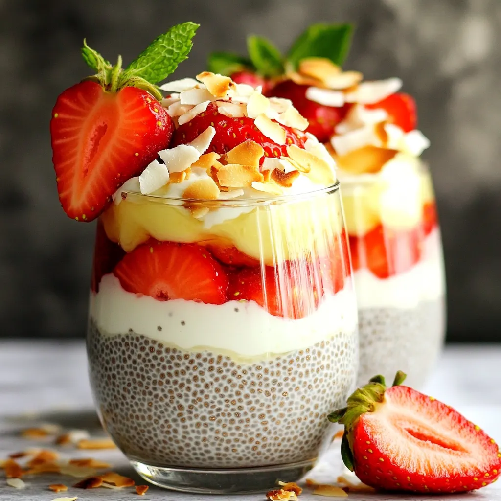Now it’s time to layer your pudding. Take serving glasses or bowls and start with a layer of chia pudding. Then, add a layer of sliced strawberries. Repeat the layers until you fill the glass. For a great finish, sprinkle toasted coconut flakes on top. Add a few fresh mint leaves for color and flavor. Serve it chilled to highlight the beautiful layers!