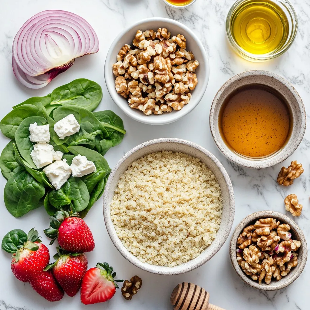 In a large mixing bowl, add the cooked quinoa, spinach, sliced strawberries, crumbled feta cheese, chopped walnuts, and red onion.