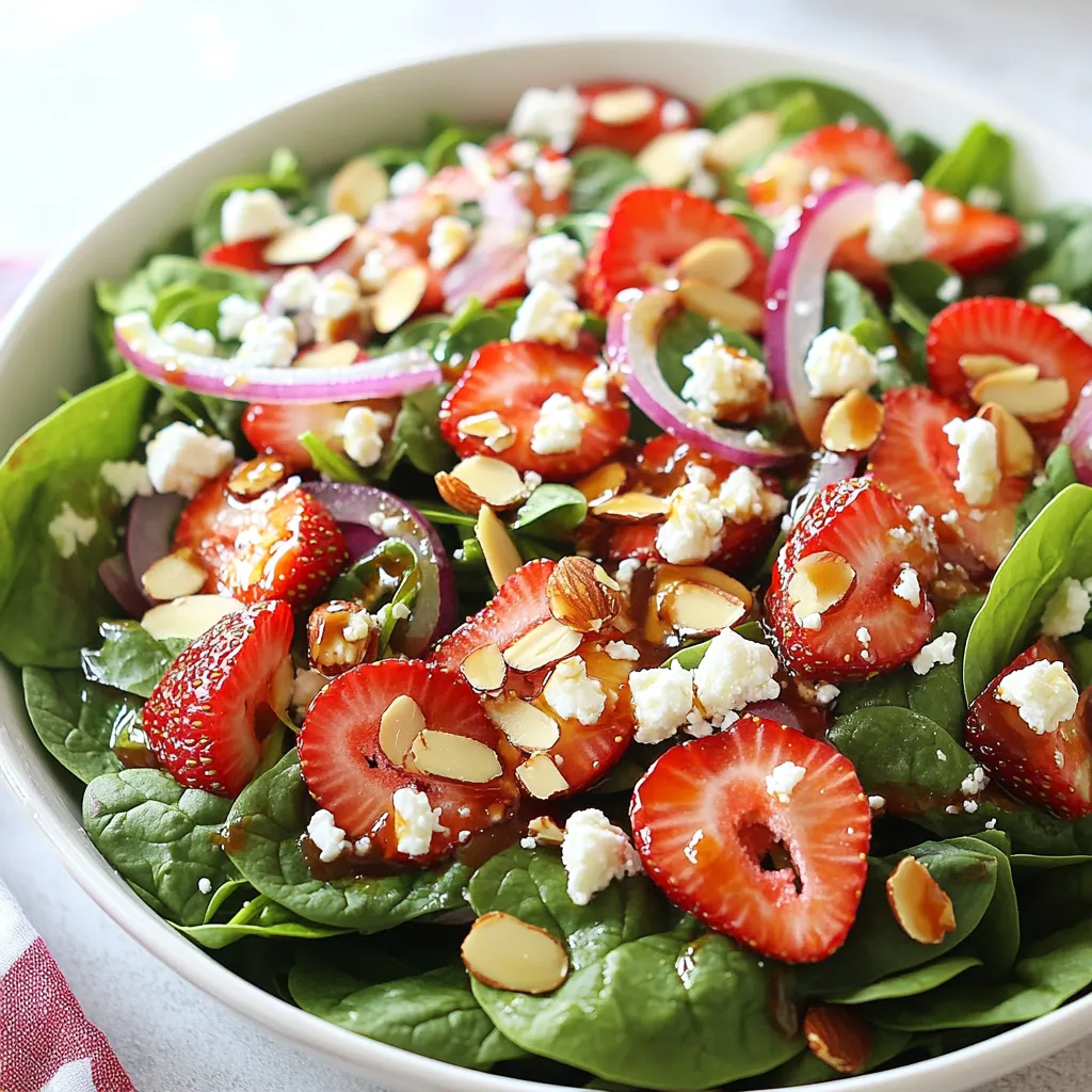 To make a bright and tasty Strawberry Spinach Salad, start with fresh produce. You need four cups of baby spinach. This greens base gives your salad a nice crunch and a vibrant color. Next, slice up one cup of fresh strawberries. They add sweetness and a pop of red. Finally, add a quarter of a red onion, thinly sliced. This onion adds a sharp flavor that balances the sweet strawberries.