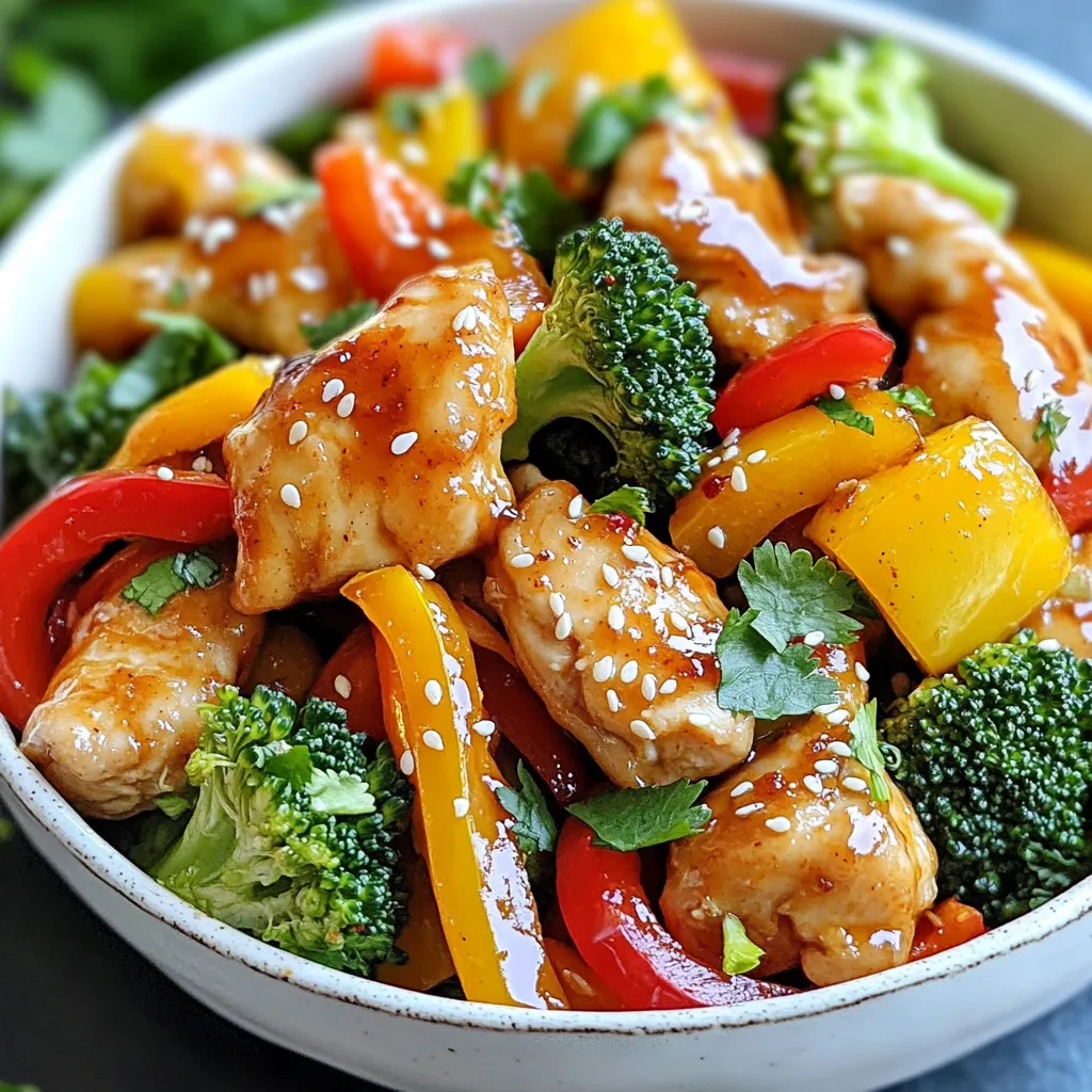 A flavorful stir fry featuring chicken, colorful vegetables, and a sweet chili sauce.