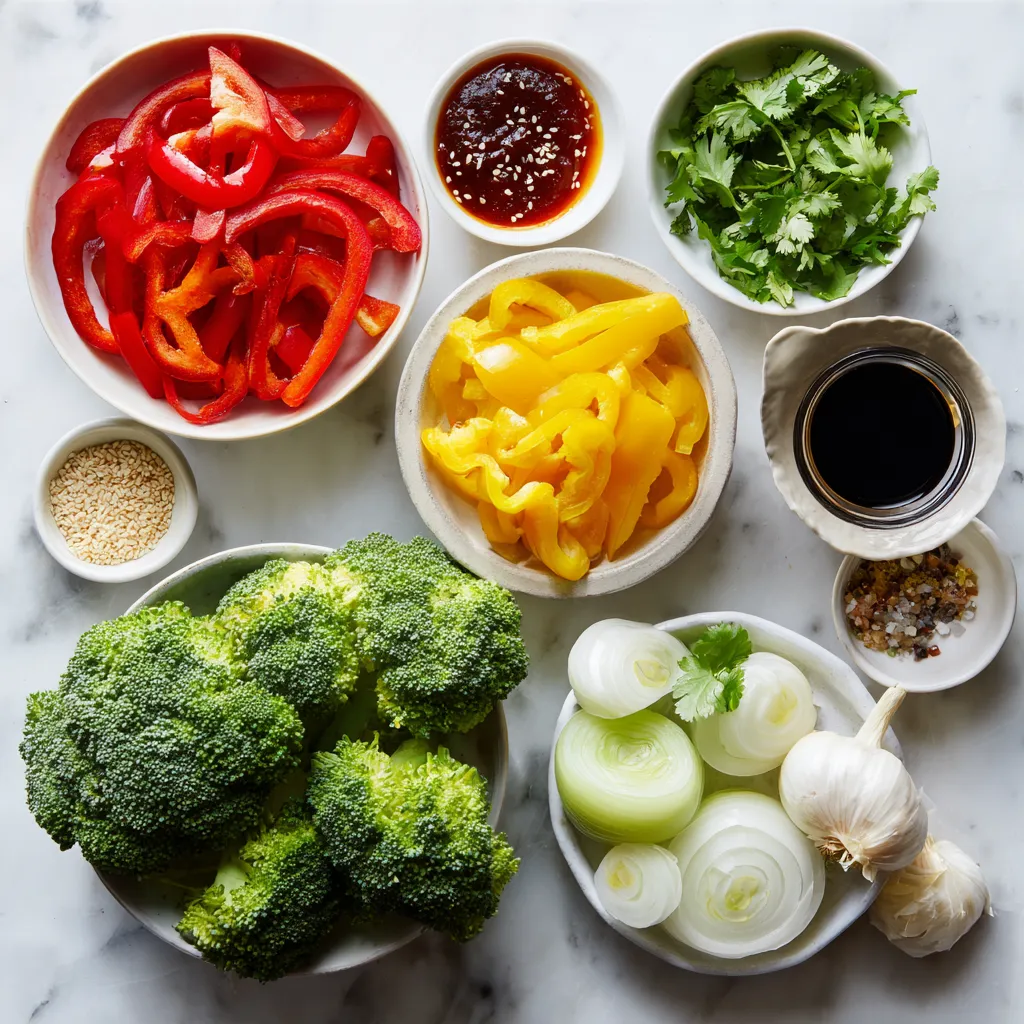 For the sauce, sweet chili sauce brings a delightful kick. Soy sauce adds depth, while cornstarch thickens the dish. The garlic and ginger give it a warm, cozy aroma. Finally, sesame seeds and cilantro elevate the look and taste. Each ingredient plays a role in making this stir fry both tasty and appealing.