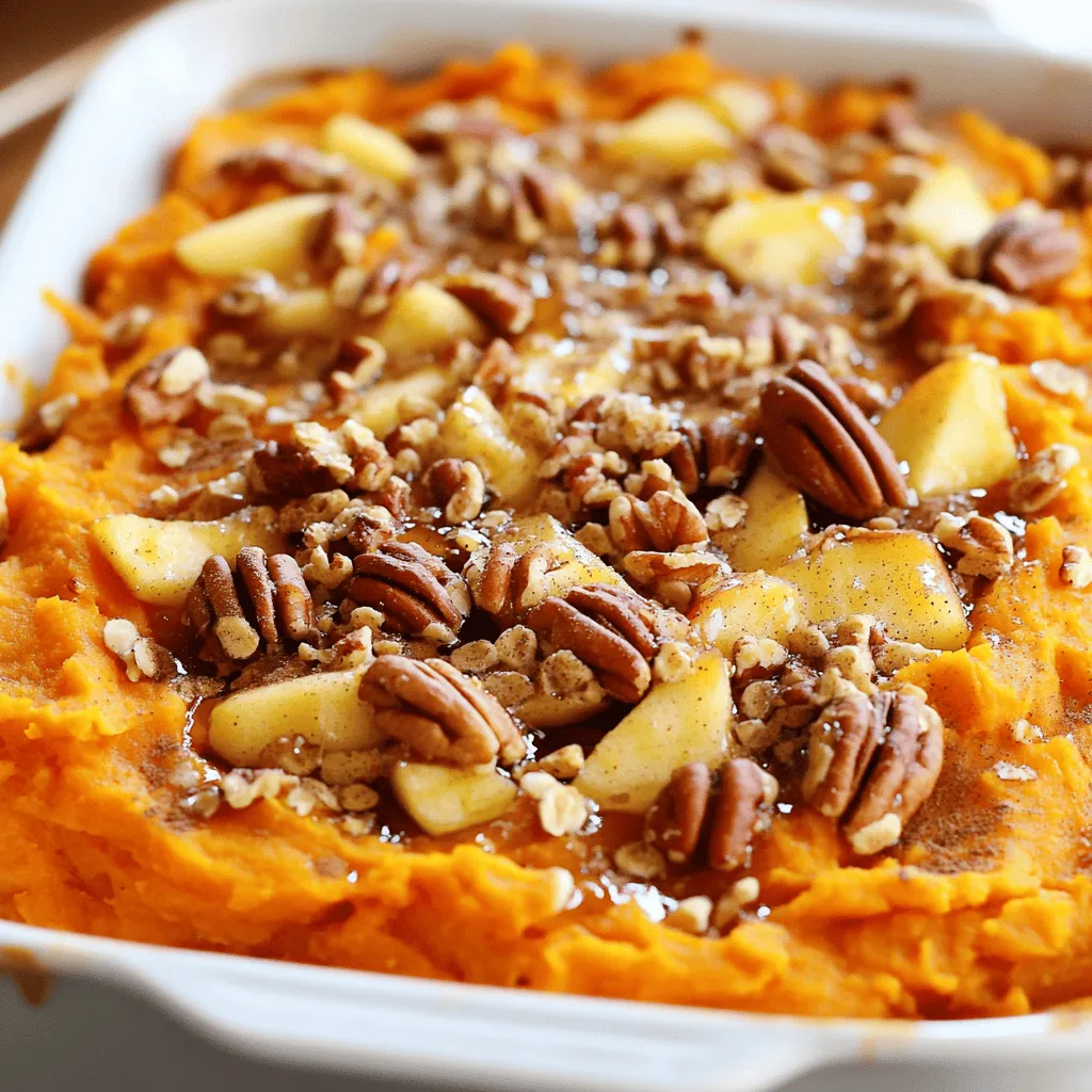 The key ingredients in Sweet Potato Apple Casserole create its rich flavor and texture. Here’s what you need: - 4 medium sweet potatoes, peeled and cubed - 2 large apples (such as Granny Smith), cored and diced - 1/2 cup maple syrup - 1/4 cup brown sugar - 1 teaspoon cinnamon - 1/2 teaspoon nutmeg - 1/4 teaspoon ginger - 1/4 cup unsalted butter, melted - 1 cup pecans, chopped - 1/3 cup oats - 1 pinch of salt Sweet potatoes bring a creamy texture and natural sweetness. I love using Granny Smith apples for their tartness, which balances the dish. Sweeteners like maple syrup and brown sugar add depth. The spices—cinnamon, nutmeg, and ginger—infuse warmth and flavor. Lastly, the pecans and oats form a crunchy topping. This blend of ingredients makes the casserole both tasty and inviting. Enjoy the process of gathering these ingredients; it sets the stage for a wonderful dish! First, preheat your oven to 375°F (190°C). This step is key for even cooking. Next, prepare the sweet potatoes. Peel and cube four medium sweet potatoes. Place them in a large pot. Cover the potatoes with salted water. Boil for about 15-20 minutes or until tender. You want them soft enough to mash. Drain the water and let them cool slightly. Now it’s time to mash the sweet potatoes. In a large mixing bowl, mash until smooth. Make sure there are no lumps. Then, combine the apple mixture. Dice two large Granny Smith apples. Stir these apples into the mashed sweet potatoes. Add 1/2 cup maple syrup, 1/4 cup brown sugar, 1 teaspoon cinnamon, 1/2 teaspoon nutmeg, 1/4 teaspoon ginger, and 1/4 cup melted butter. Mix until well combined. This blend gives the casserole its rich flavor. Let’s assemble the casserole now. Grease a 9x13 inch baking dish. Pour the sweet potato-apple mixture into the dish. Spread it evenly across the bottom. In a separate bowl, combine 1 cup chopped pecans, 1/3 cup oats, and a pinch of salt. Sprinkle this topping evenly over the sweet potato-apple layer. Bake in the preheated oven for 30-35 minutes. Check for doneness by looking for a golden brown topping. Once done, remove it from the oven. Allow it to cool slightly before serving. To make a great Sweet Potato Apple Casserole, start with tender sweet potatoes. Boil them until they are soft but not mushy. This step is key for a smooth texture. After mashing, mix in your diced apples. Granny Smith apples work best here. They add a nice tartness that balances the sweet flavors. Next, focus on the sweet and savory balance. Use maple syrup and brown sugar for sweetness. Add spices like cinnamon, nutmeg, and ginger for warmth. These flavors work well together and create a comforting dish. Garnishing can elevate your casserole. Consider adding a sprinkle of cinnamon on top before serving. A dollop of whipped cream or a scoop of vanilla ice cream makes it extra special. For pairing, serve the casserole with a simple green salad. This adds freshness to your meal. You can also enjoy it with roasted meats. The sweet notes complement savory dishes perfectly. {{image_2}} You can change some ingredients in this casserole to fit your taste. - Alternative fruits: Instead of apples, use pears for a sweeter flavor. You can also try peaches or cranberries for a tart twist. Each fruit adds its own unique taste and texture. - Different sweeteners: Maple syrup is great, but honey or agave syrup can work too. If you want less sugar, try using mashed bananas. They add sweetness and moisture. This casserole can fit many diets with a few easy changes. - Vegan options: To make it vegan, swap the butter for coconut oil or vegan butter. Use maple syrup or agave syrup for sweetness. - Gluten-free alternatives: Check if your oats are gluten-free. If not, use ground nuts or gluten-free breadcrumbs. This keeps the crunch without gluten. These swaps and adjustments keep the dish tasty and fun for everyone! To store leftovers, let the casserole cool first. Then, place it in an airtight container. This keeps it fresh. You can keep it in the fridge for up to five days. Make sure to cover it well to avoid drying out. The best container types are glass or plastic. Glass containers let you see the food inside. Plastic containers are light and easy to stack. Either option works well for storage. You can freeze the casserole for longer storage. First, let it cool completely. Then, wrap it tightly in plastic wrap. After that, place it in a freezer-safe container or bag. This prevents freezer burn and keeps the flavor. When you’re ready to eat, thaw it overnight in the fridge. To reheat, bake it in the oven at 350°F (175°C). Cover it with foil to keep it moist. Heat for about 25-30 minutes. Enjoy the warm, tasty casserole! To make Sweet Potato Apple Casserole, follow these key steps: 1. Preheat your oven to 375°F (190°C). 2. Boil four medium sweet potatoes, peeled and cubed, in salted water for 15-20 minutes. They should be tender. 3. Drain the sweet potatoes and let them cool a bit. 4. Mash the sweet potatoes until they are smooth in a large bowl. 5. Add two large diced apples, ½ cup maple syrup, ¼ cup brown sugar, 1 teaspoon cinnamon, ½ teaspoon nutmeg, ¼ teaspoon ginger, and ¼ cup melted unsalted butter. Mix well. 6. Grease a 9x13 inch baking dish and pour the mixture in, spreading it evenly. 7. In another bowl, mix 1 cup chopped pecans, ⅓ cup oats, and a pinch of salt. Sprinkle this on top of the casserole. 8. Bake for 30-35 minutes, until the topping is golden brown. Yes, you can use different types of apples. Granny Smith apples work well for their tartness. Other good choices include: - Honeycrisp: Sweet and crisp, great for texture. - Fuji: Sweet and juicy, adds nice flavor. - Braeburn: Balanced sweetness, perfect for baking. Feel free to mix varieties for a unique taste! You can store sweet potato casserole in the fridge for about 3-5 days. Use an airtight container to keep it fresh. If you want to keep it longer, you can freeze it. It will last for up to 3 mon