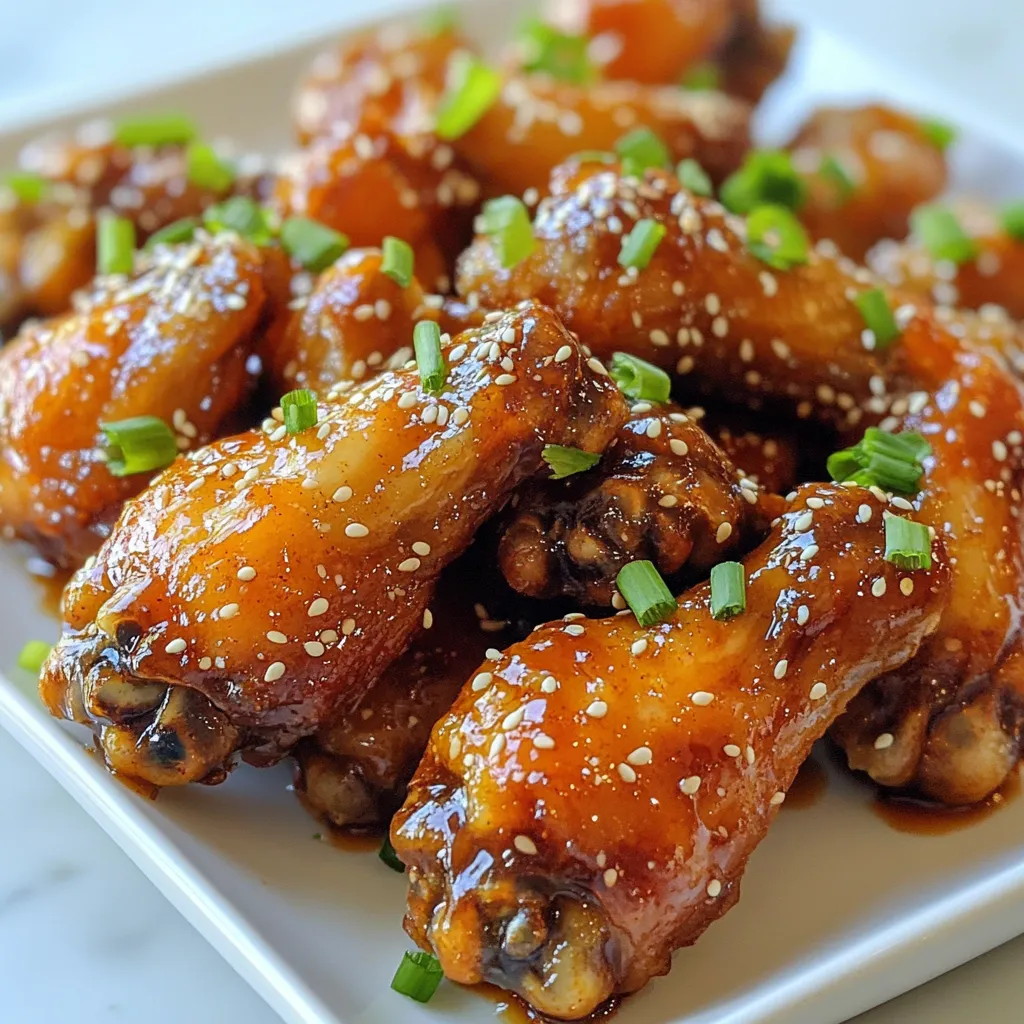 - 2 pounds chicken wings - 1/2 cup soy sauce - 1/4 cup honey - 4 cloves garlic, minced - 1 tablespoon fresh ginger, grated - 2 tablespoons sesame oil - 1 tablespoon rice vinegar - 1 teaspoon red pepper flakes (optional) - 1 tablespoon cornstarch (for thickening) - Sesame seeds and chopped green onions for garnish You need fresh chicken wings for this recipe. Choose wings that look plump and juicy. Next, gather your marinade components. Soy sauce gives a nice salty flavor. Honey adds sweetness, while garlic and ginger bring a kick. Sesame oil adds richness, and rice vinegar gives a hint of tang. The red pepper flakes are optional. They add a bit of heat. If you like spicy food, consider including them. Lastly, gather sesame seeds and green onions. These will make your wings look pretty and add crunch. With these ingredients, you will create a dish that is both tasty and visually appealing. {{ingredient_image_1}} To make the marinade, grab a large bowl. Add the soy sauce, honey, minced garlic, grated ginger, sesame oil, rice vinegar, and red pepper flakes if you like spice. Use a whisk to mix everything well. This blend creates a sweet and savory flavor. If you want a different taste, consider adding orange juice or lime for a citrus touch. You can also swap honey for maple syrup for a different sweetness. Once your marinade is ready, add the chicken wings. Make sure they are well coated in the mixture. Cover the bowl with plastic wrap and place it in the fridge. Let the wings marinate for at least 1 hour. For more flavor, marinate them overnight. This allows the wings to soak up all the deliciousness. Now, it’s time to bake! First, preheat your oven to 400°F (200°C). Line a baking sheet with foil for easy cleanup. Place a wire rack on top of the baking sheet. This helps the hot air circulate around the wings, making them crispy. When the wings are done baking, it’s time to glaze. In the last 5 minutes, brush the thickened sauce over the wings. This adds a shiny finish and extra flavor. After they come out of the oven, sprinkle sesame seeds and chopped green onions on top. They make the wings look great and add a fresh crunch. Enjoy your Sweet Soy Garlic Wings! To get crispy wings, use a wire rack. Place the wings on the rack above a baking sheet. This lets hot air flow all around them. Bake at 400°F (200°C) for 25-30 minutes. Flip the wings halfway for even cooking. If you want extra crispiness, broil them for the last few minutes. Keep an eye on them to avoid burning. You can adjust sweetness and spice in the marinade. If you like it sweeter, add more honey. For more spice, increase the red pepper flakes. Taste your marinade before adding the wings. This way, you can find the perfect balance that suits your taste. You can make these wings ahead of time. Marinate them for at least 1 hour or overnight for more flavor. After cooking, let them cool completely. Store them in an airtight container in the fridge for up to 3 days. To reheat, bake them at 375°F (190°C) for 10-15 minutes. This will help restore their crispiness. Pro Tips Marinate for Longer: For the best flavor, marinate the wings overnight. This allows the marinade to deeply penetrate the meat, resulting in juicier and more flavorful wings. Use a Wire Rack: Elevating the wings on a wire rack while baking allows hot air to circulate around them, ensuring they become crispy on all sides and preventing sogginess. Adjust the Spice Level: If you prefer milder wings, reduce or omit the red pepper flakes. Alternatively, increase them for a spicier kick! Make Extra Sauce: If you love a saucy wing, double the marinade recipe. You can use it as a dipping sauce for added flavor when serving. {{image_2}} You can make your wings spicy by adding different chili sauces. Start with Sriracha or chili garlic sauce. Mix these into the marinade to give your wings a kick. You can adjust the spice level by adding more or less. For a fun twist, try using a sweet chili sauce for some heat and sweetness. This adds depth to the flavor and makes the wings even more exciting. If you want to use an air fryer, adjust your cooking time and temperature. Preheat your air fryer to 375°F (190°C). Cook the wings for about 20-25 minutes. Flip them halfway through for even cooking. The air fryer makes the wings crispy without deep frying. It’s a great option for a healthier version of this dish. You can enjoy these flavors with a vegetarian twist. Use cauliflower instead of chicken wings. Cut cauliflower into bite-sized florets. Marinate them just like you would the chicken. Bake or air fry at 400°F (200°C) for about 20-25 minutes. This gives you a tasty, meat-free option that everyone can enjoy. After you make your sweet soy garlic wings, they need the right care. Let the wings cool to room temperature. Then, place them in an airtight container. Store them in the fridge. They will stay fresh for about 3 to 4 days. If you want to keep them longer, consider freezing. For long-term storage, freezing is your best option. Start by cooling the wings completely. Then, wrap them tightly in plastic wrap. Next, place them in a freezer-safe bag or container. Be sure to remove as much air as possible. This helps prevent freezer burn. You can keep them frozen for up to 3 months. When it's time to enjoy those wings again, reheating them is key. The best method is to use an oven. Preheat the oven to 350°F (175°C). Place the wings on a baking sheet. Bake for about 15 to 20 minutes. This keeps them crispy and tasty. You can also use an air fryer for quick reheating. Just set it at 350°F and cook for about 5 to 10 minutes. Enjoy the delicious, crispy wings! You can serve sweet soy garlic wings with many tasty side dishes. Here are some great ideas: - Coleslaw: Its crunch pairs well with the wings. - Rice: Steamed white or brown rice soaks up the sauce. - Vegetable Sticks: Carrots and celery add a fresh crunch. - Potato Wedges: Crispy, seasoned wedges are always a h