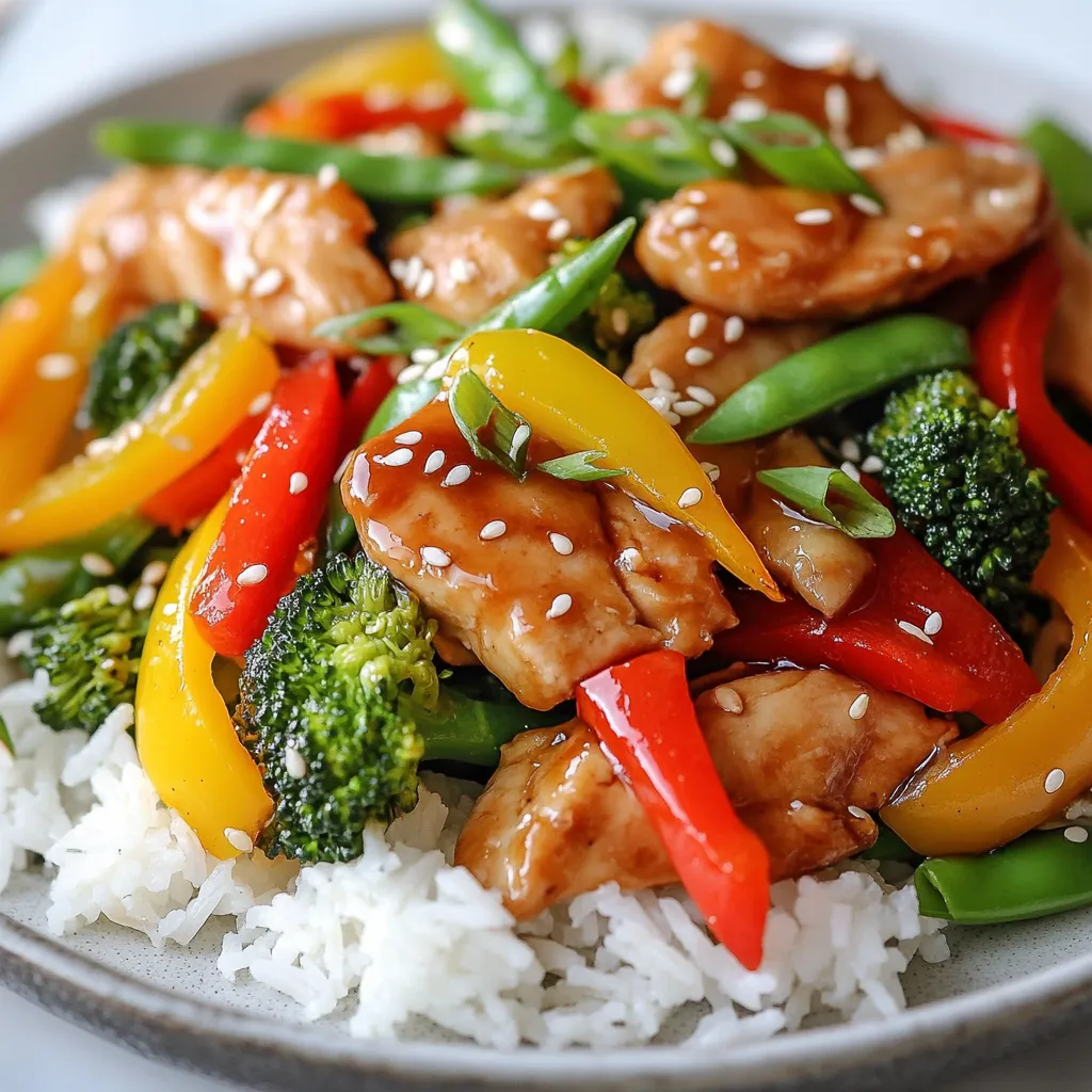 A delicious and quick stir fry featuring tender chicken and colorful vegetables in a savory teriyaki sauce.