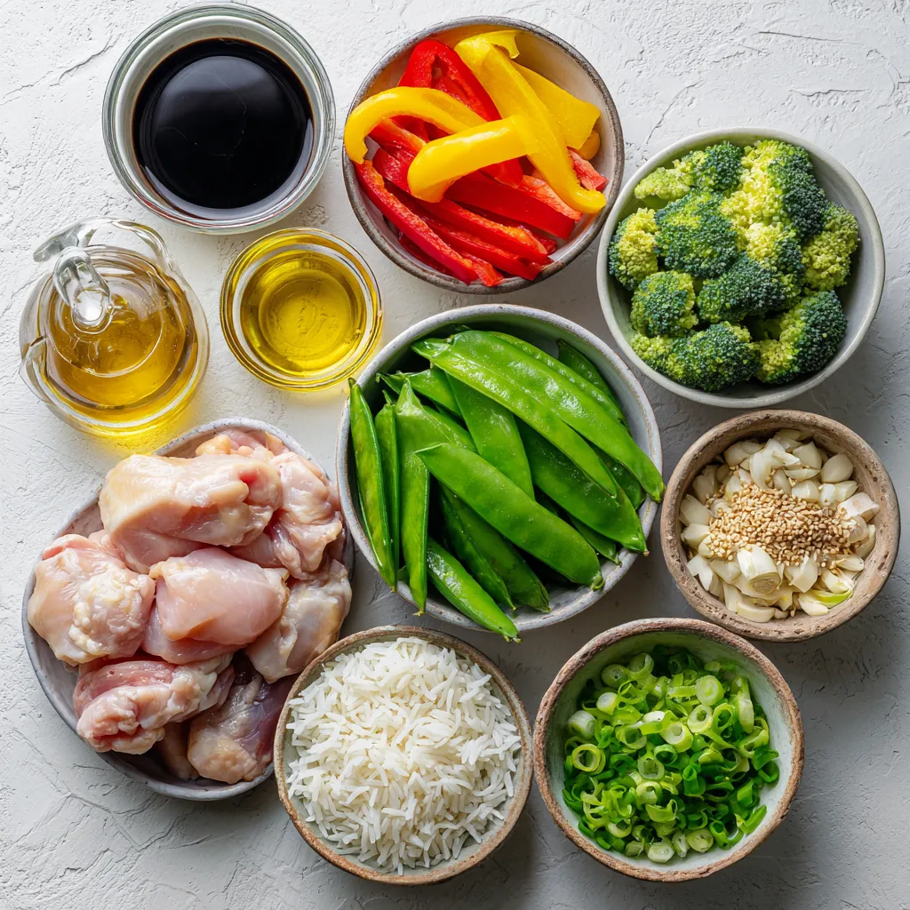 For the teriyaki chicken stir fry, the main ingredients focus on fresh and vibrant flavors. The chicken thighs offer rich taste and tenderness. The mix of colorful vegetables adds crunch and nutrients. The teriyaki sauce blends sweet and savory notes. This creates a perfect balance in every bite.