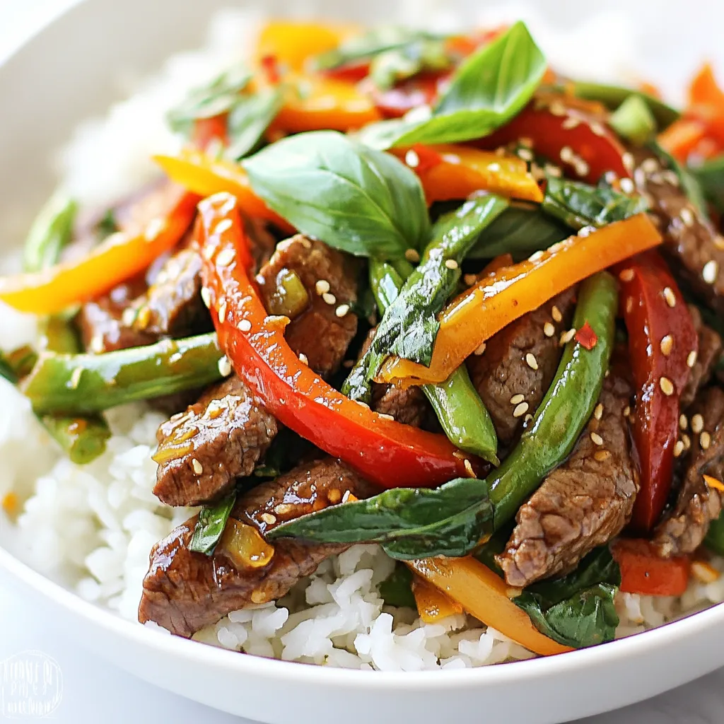A flavorful stir fry featuring tender beef, fresh Thai basil, and vibrant vegetables.