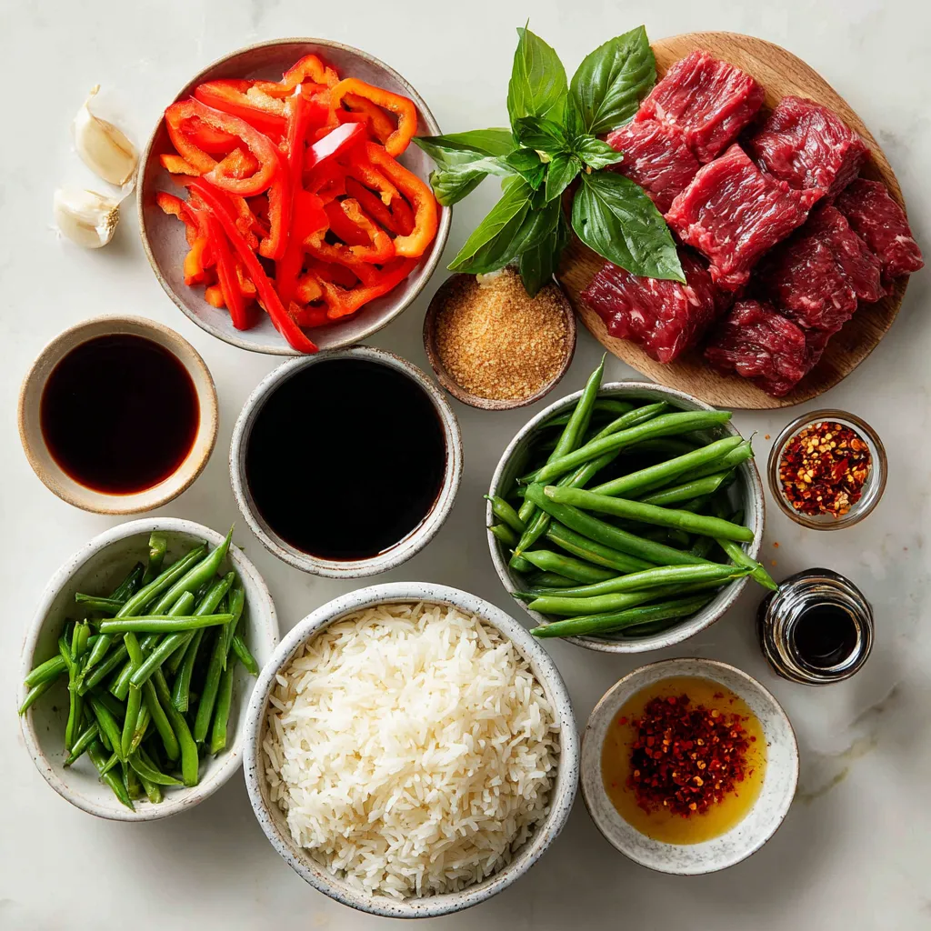 Gather these items before you start cooking. The fresh Thai basil gives the dish its unique flavor. The beef sirloin adds a nice texture. You can use other veggies, but I love red bell pepper and green beans. They make the dish colorful and tasty.