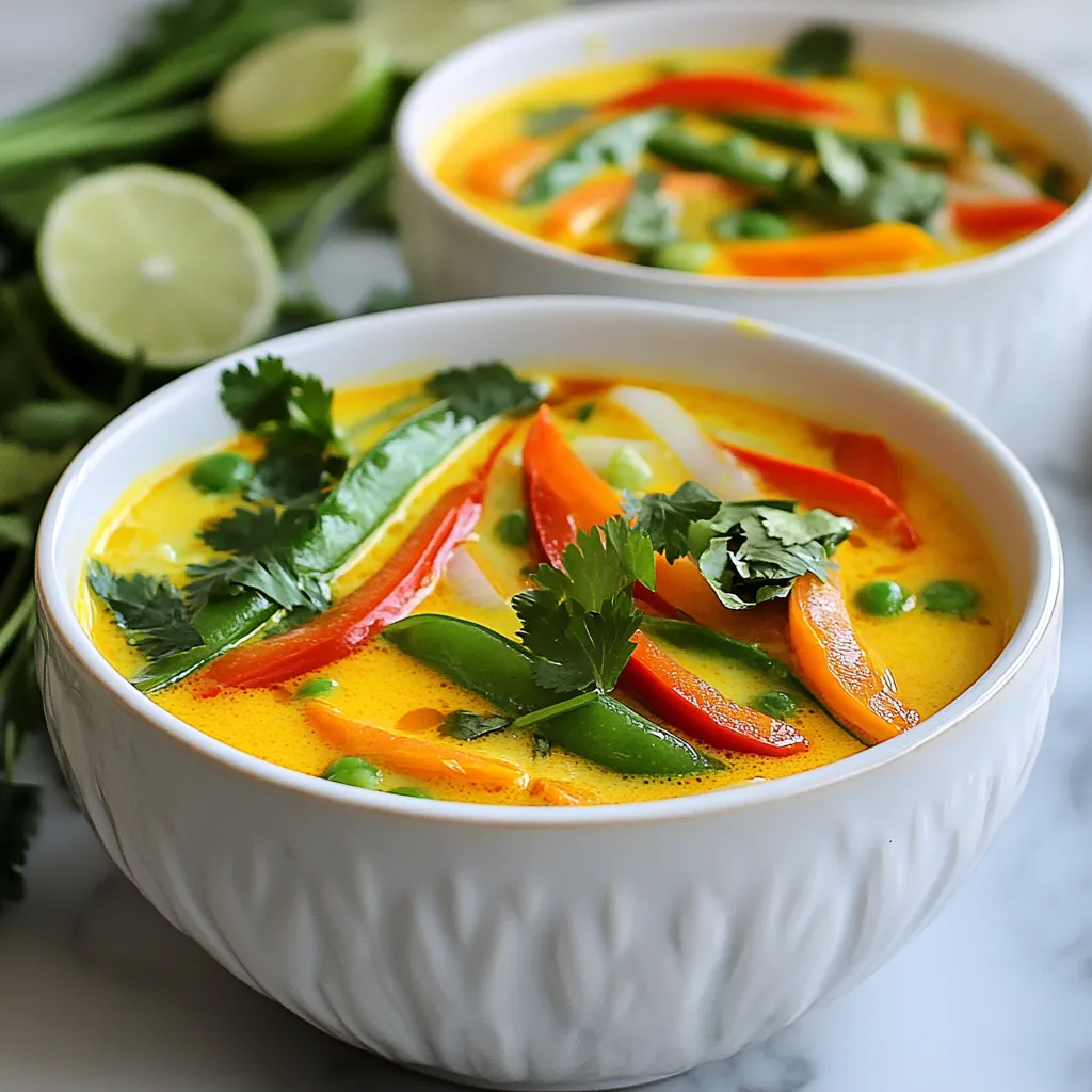 A flavorful and creamy soup made with coconut milk, vegetables, and optional protein.