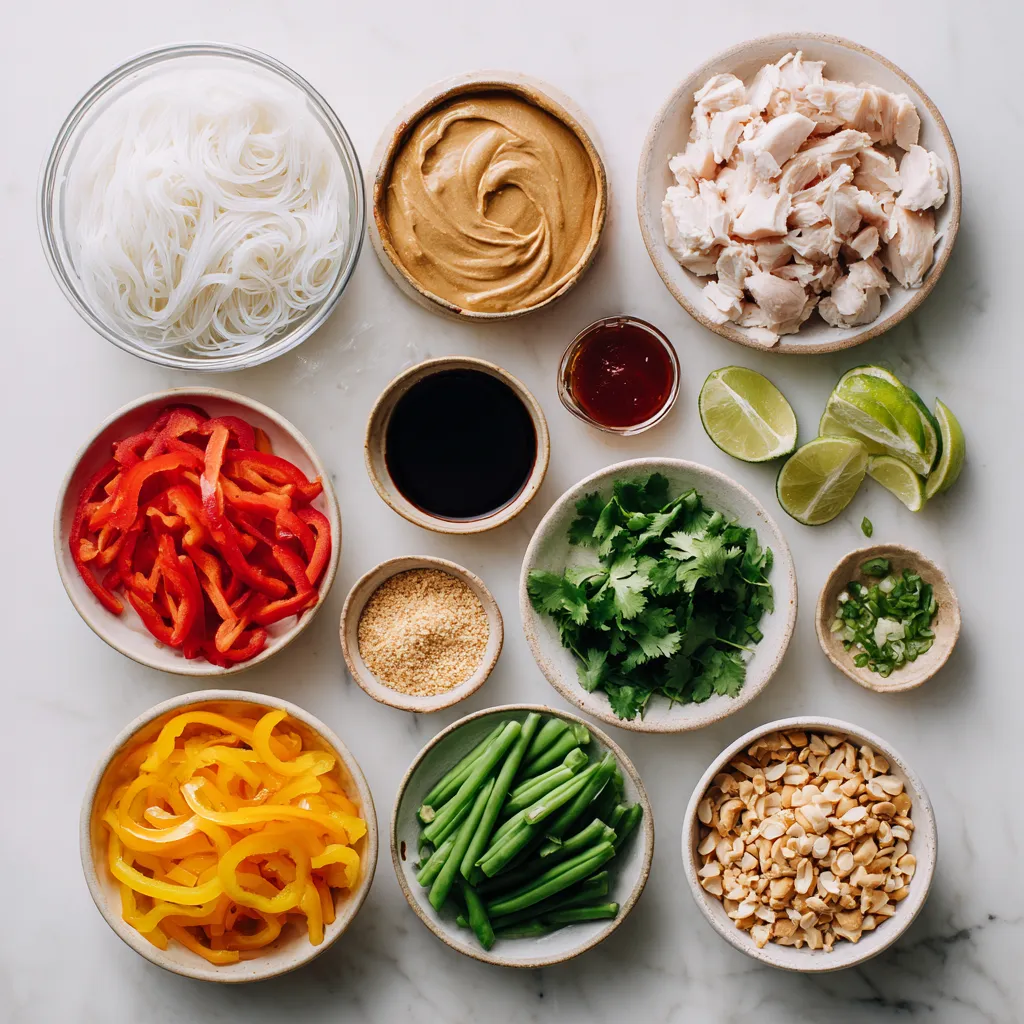A delicious and easy-to-make dish featuring rice noodles, chicken, and a creamy peanut sauce.