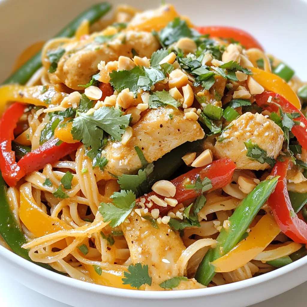 When I make Thai peanut chicken noodles, I love to focus on fresh and vibrant ingredients. The rice noodles are a must. They soak up the sauce well and have a nice texture. Chicken breast, sliced thin, cooks quickly and stays juicy. I usually use a mix of colorful bell peppers for crunch and sweetness. Snap peas add a little snap and freshness too.