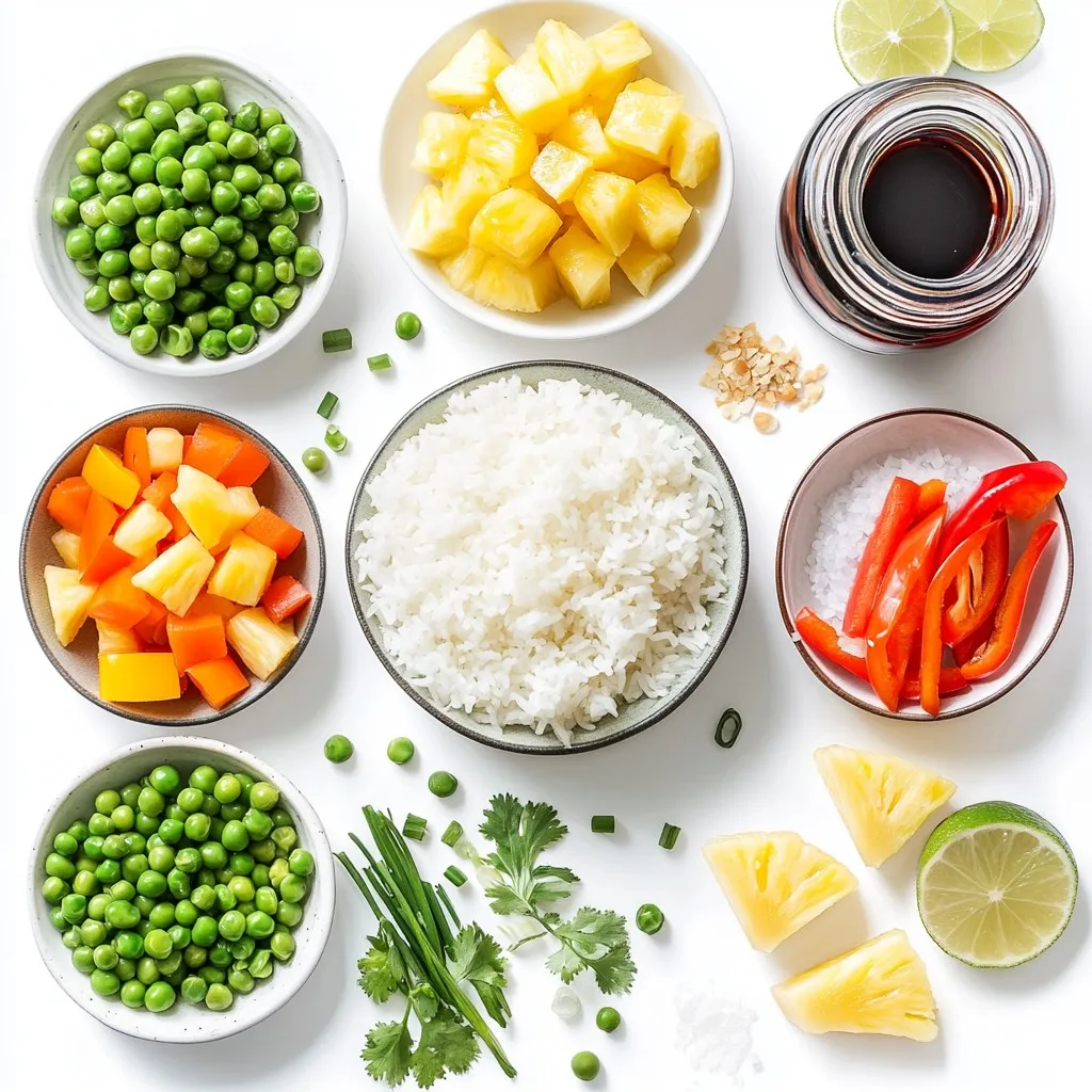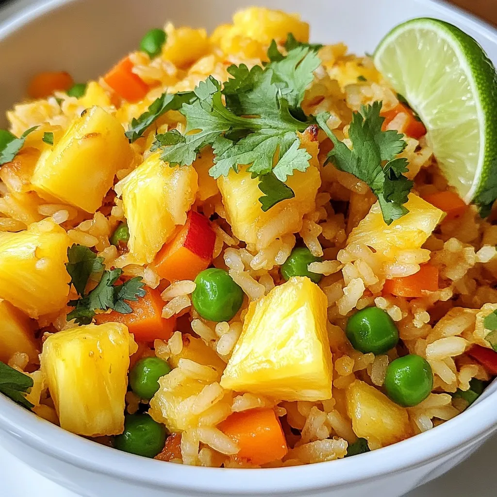 A delicious and vibrant fried rice dish featuring jasmine rice, fresh pineapple, and colorful vegetables.