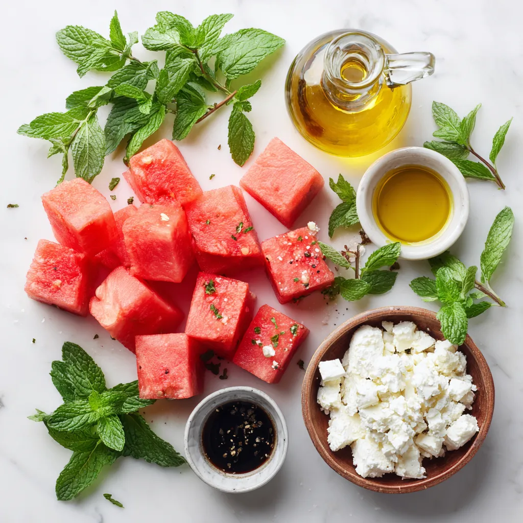 The main ingredients make this salad shine. Watermelon brings sweetness and juiciness. Feta cheese adds a salty, creamy touch. Fresh mint gives a cool, herbal note. Together, they create a bright flavor balance.
