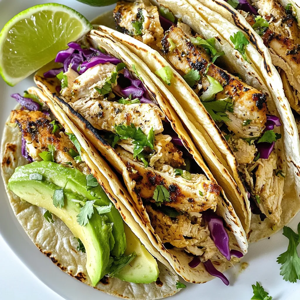 Delicious chicken tacos marinated in zesty lime and spices, topped with fresh ingredients.